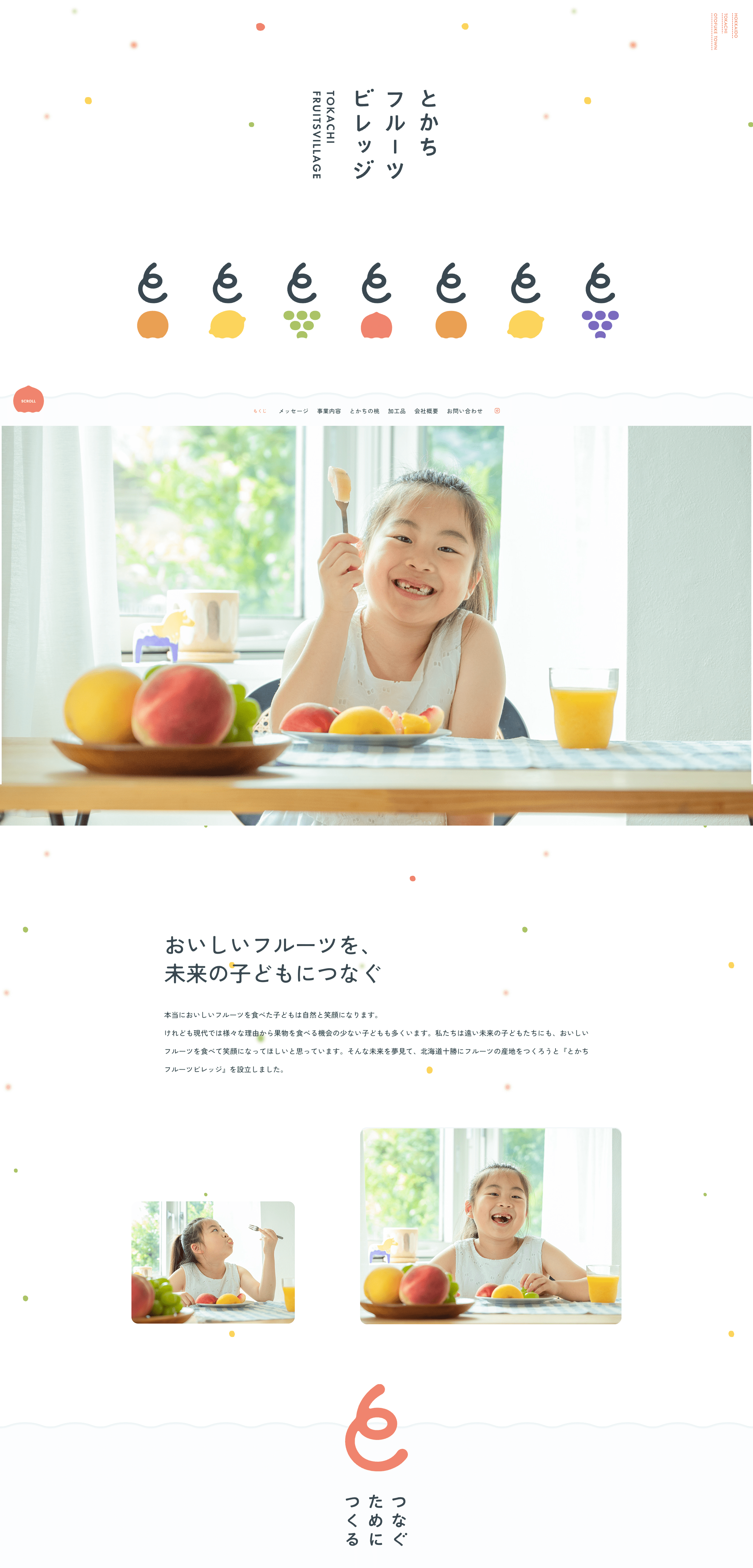 北海道十勝地方で果樹栽培に挑戦するとかちフルーツビレッジのロゴ、ウェブサイト、その他グラフィックツールをデザインしました。気候変動や環境の変化により、日本の果樹の栽培状況が変化する中で、未来の子どもたちにも美味しい果物を食べさせたいという、代表林本氏の考えをデザインにしています。とかちの「と」をモチーフに未来・永遠を意味する螺旋のアイコンを作り、木から採れた果実が未来に届くさまを表したロゴをデザインし、各ツールに展開しています。現在栽培しているものは桃だけですが将来的には様々な果物が採れるフルーツビレッジにしたいというビジョンを表すために多様な果物に展開できるロゴとしています。ウェブサイトは雪深いとかちに果物の雪が降る様子をデザインで表現しました。